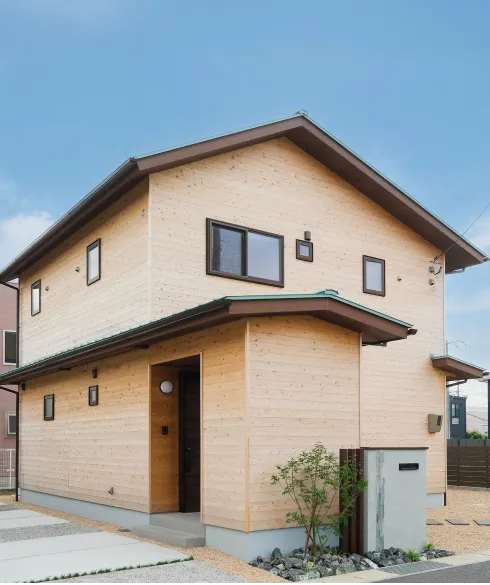 国産杉板張りの外壁は、時間とともに味わいが深まります。