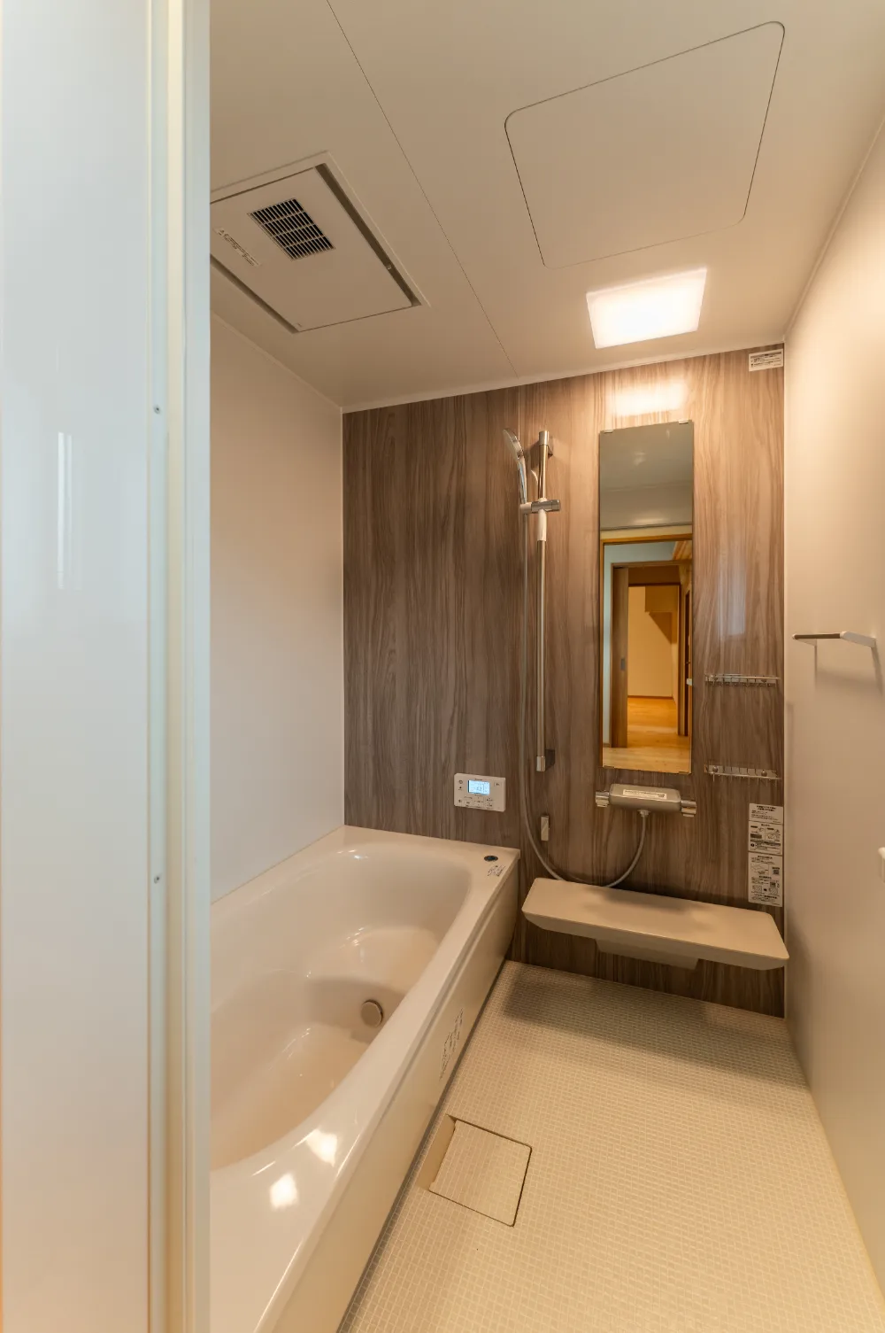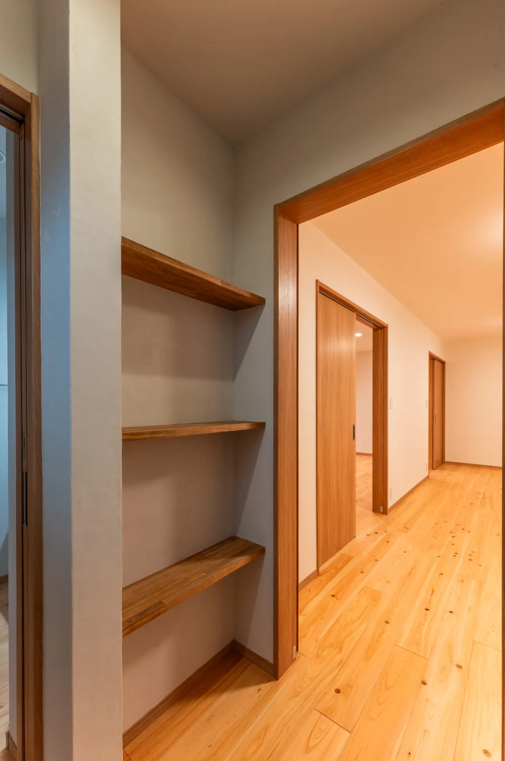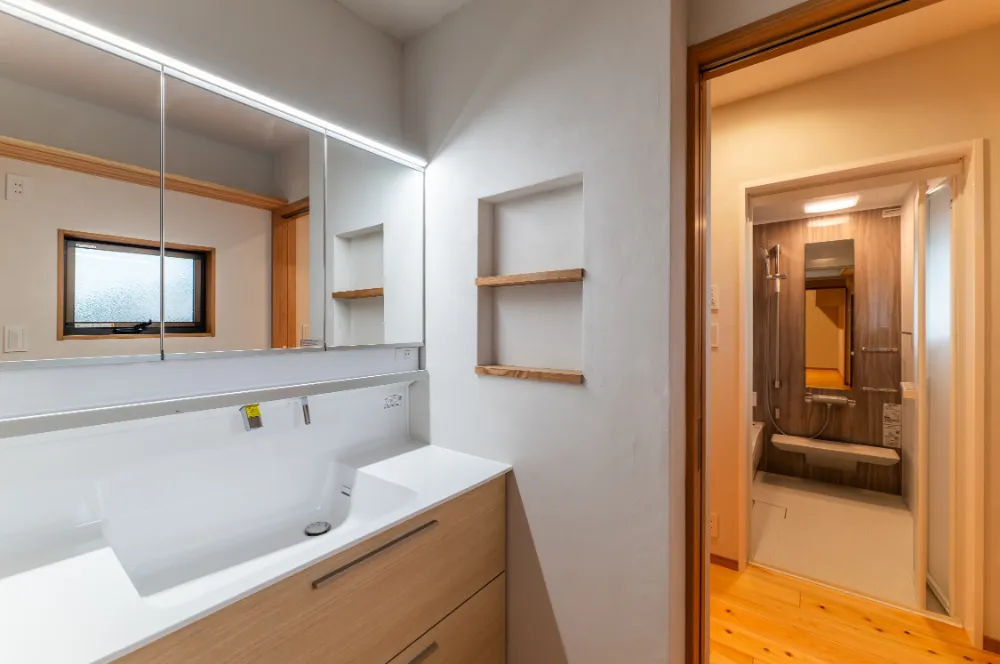暮らしを支える水回りも、全面的に生まれ変わりました。ランドリールームから洗面室、脱衣室へと続く横並び動線に、キッチンやファミリークローゼットまでを含めた回遊の流れ。水回りとクローゼットには調湿・消臭効果のあるシラス壁を使い、自然の力で爽やかな空気環境を保ち続けます。